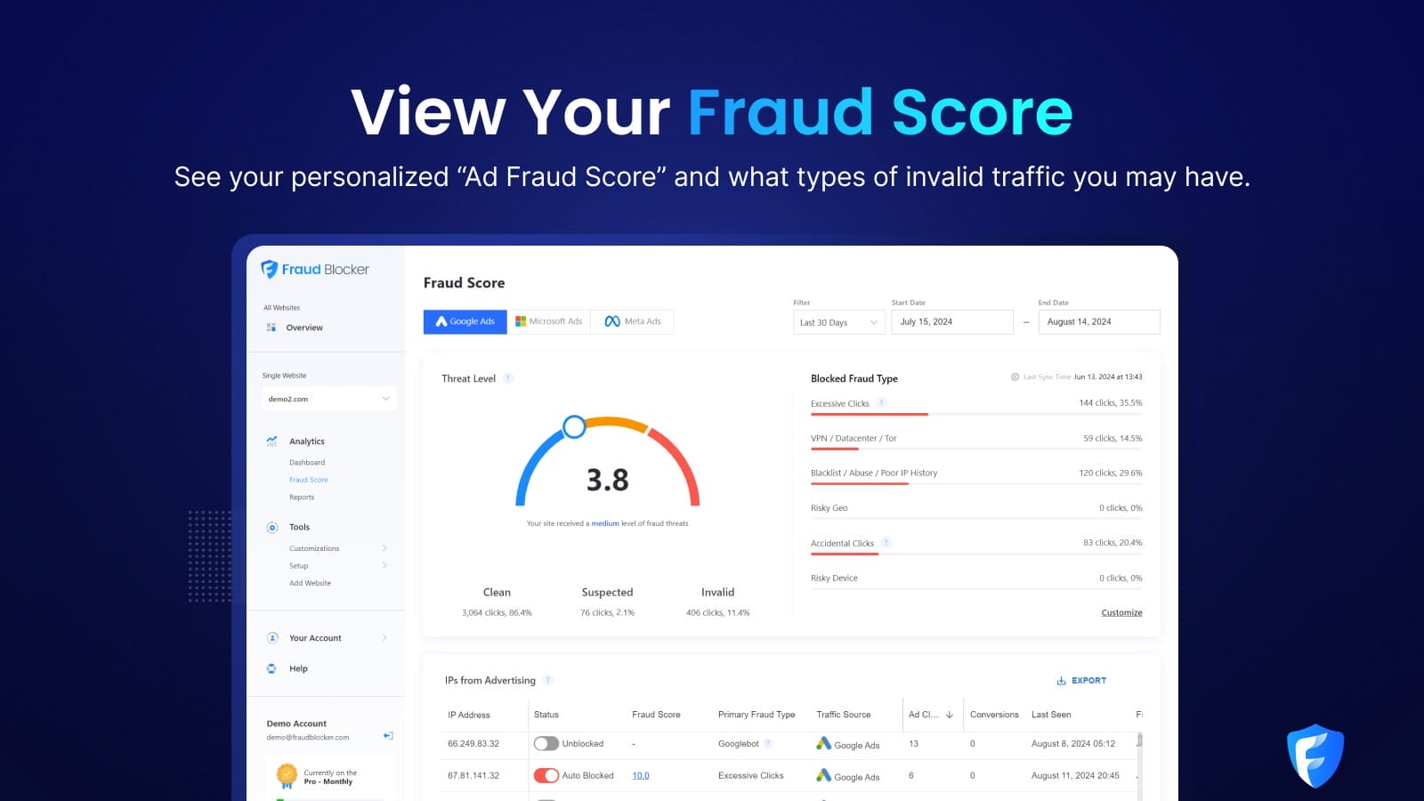 View average Fraud Scores, blocked IP addresses, and visitor data like location, device, and recent clicks