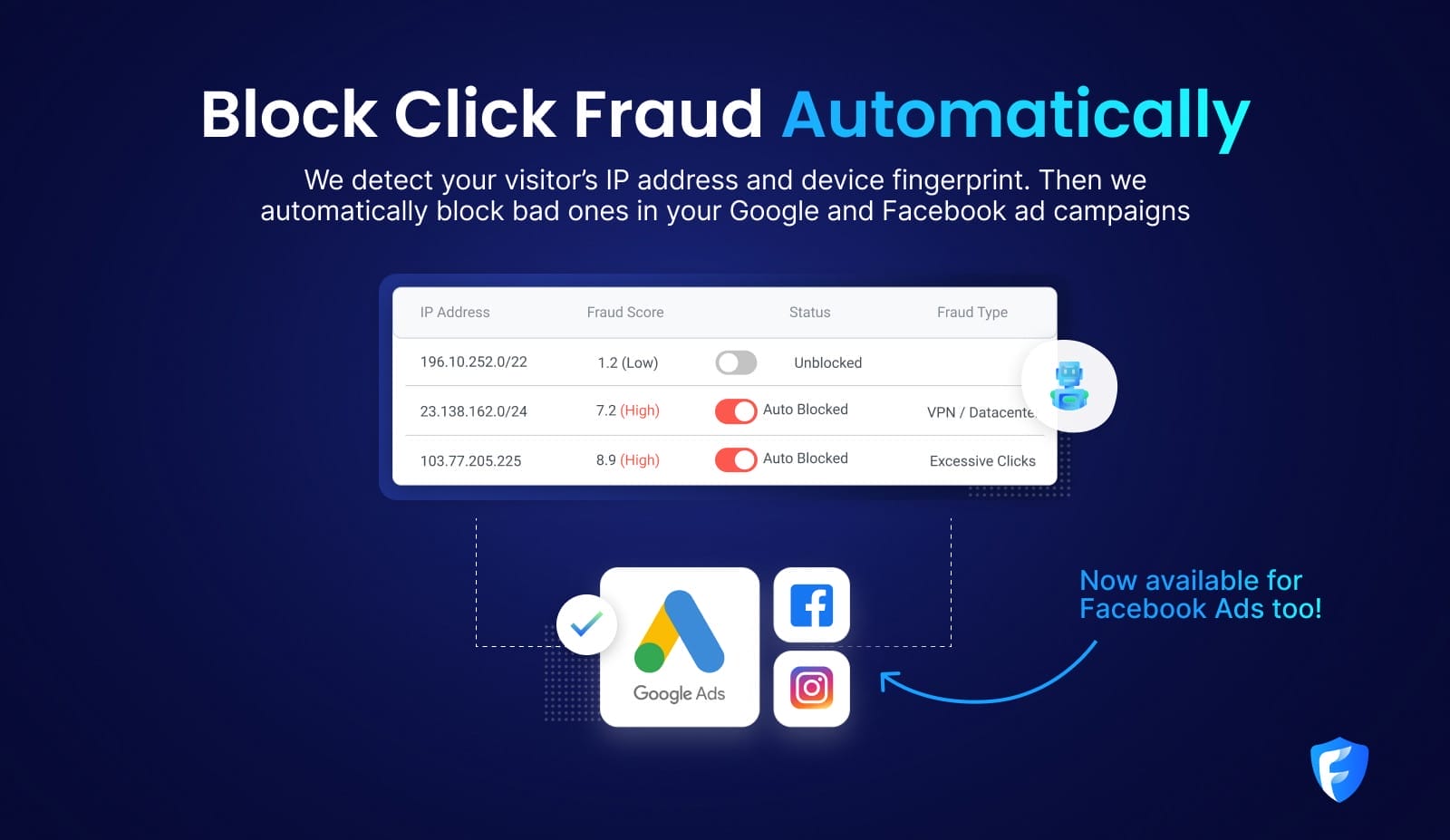 Fraud Blocker is the only tool you’ll need to prevent bots, accidental clicks, competitors, and other fraud from tanking your ad campaigns.