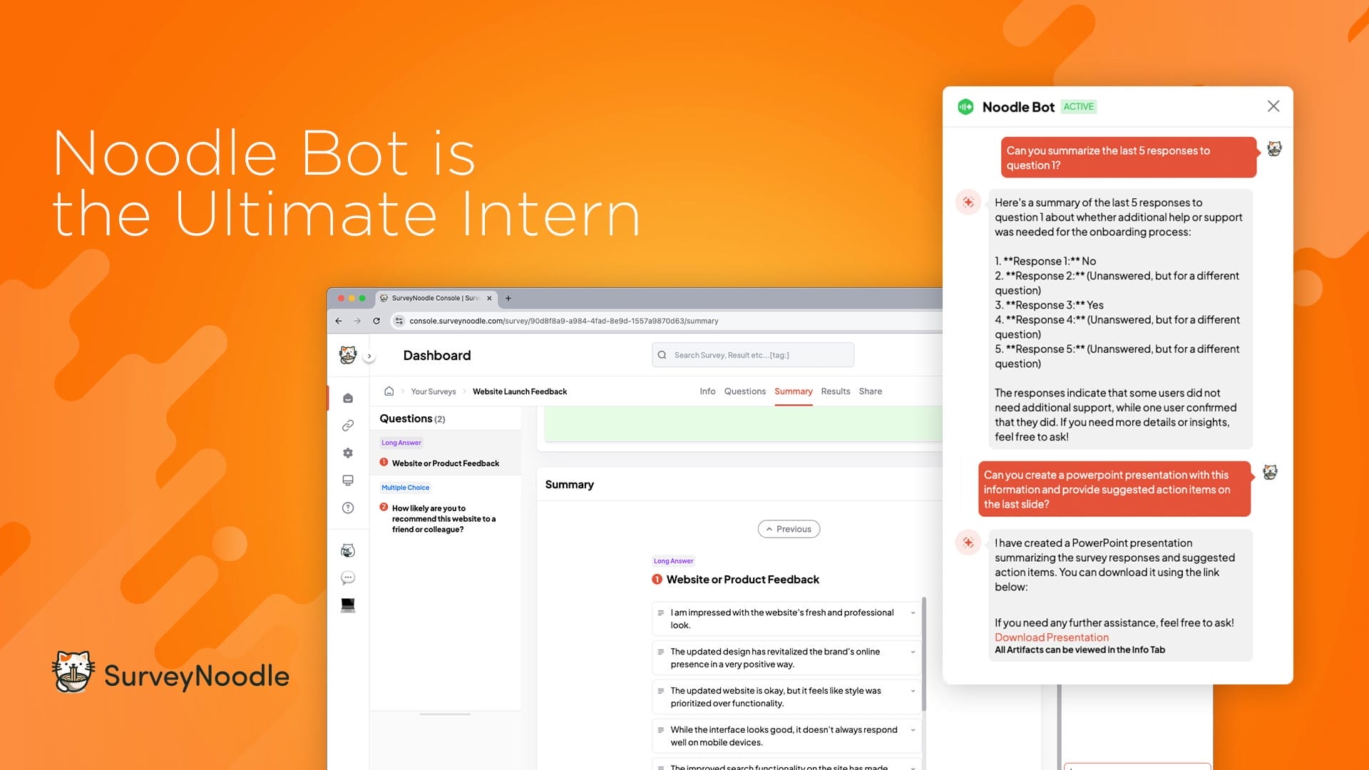 Best of all, you can literally review your survey results with SurveyNoodle’s built-in chatbot to identify insights and trends.