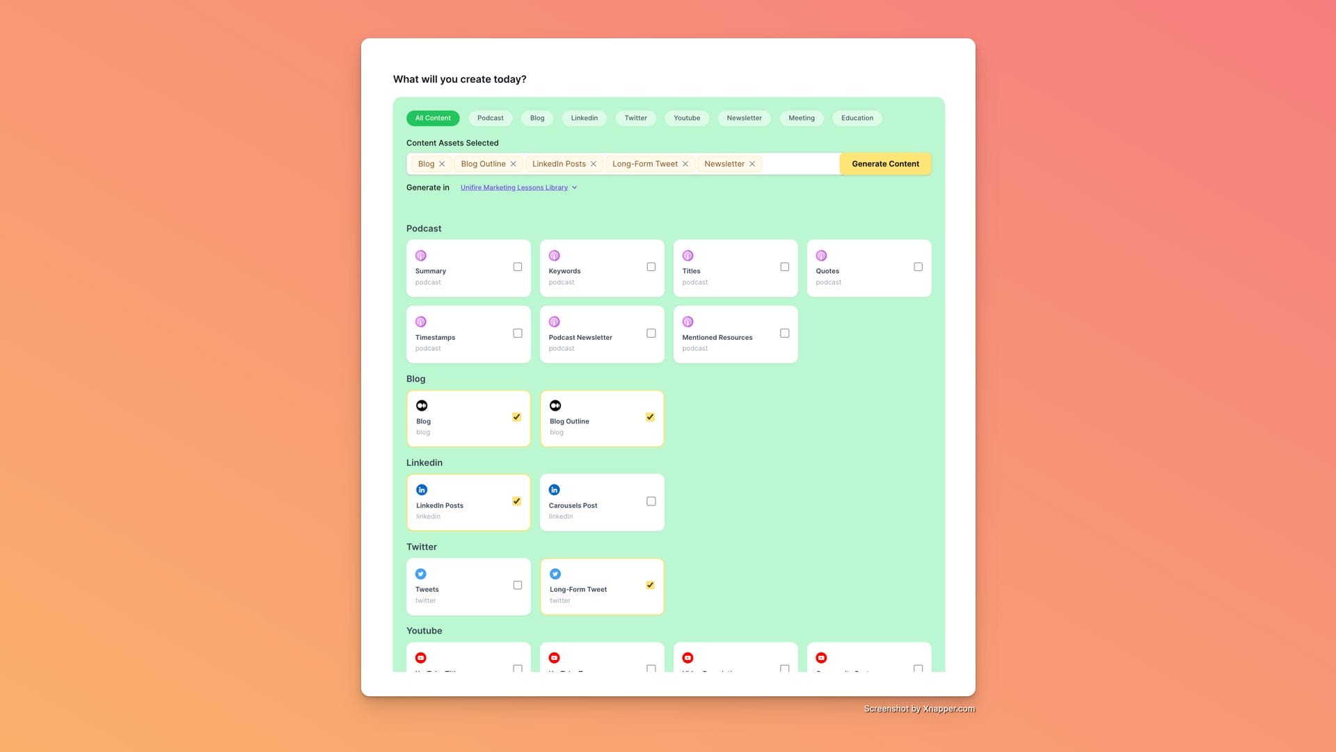 With Unifire.ai, you’ll be able to turn any piece of existing content into over 30 assets for YouTube, LinkedIn, Twitter, and beyond.