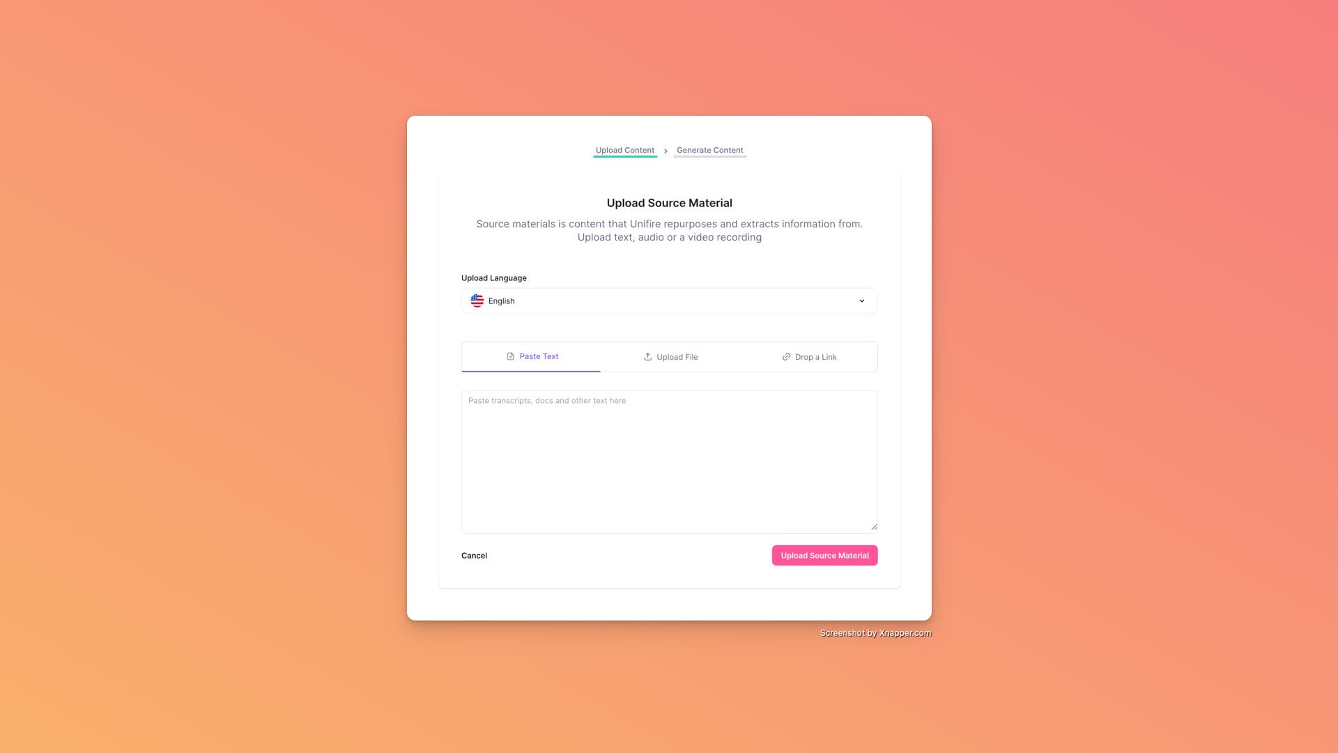 Upload your source material as a media file, YouTube link, or by copy-pasting the text