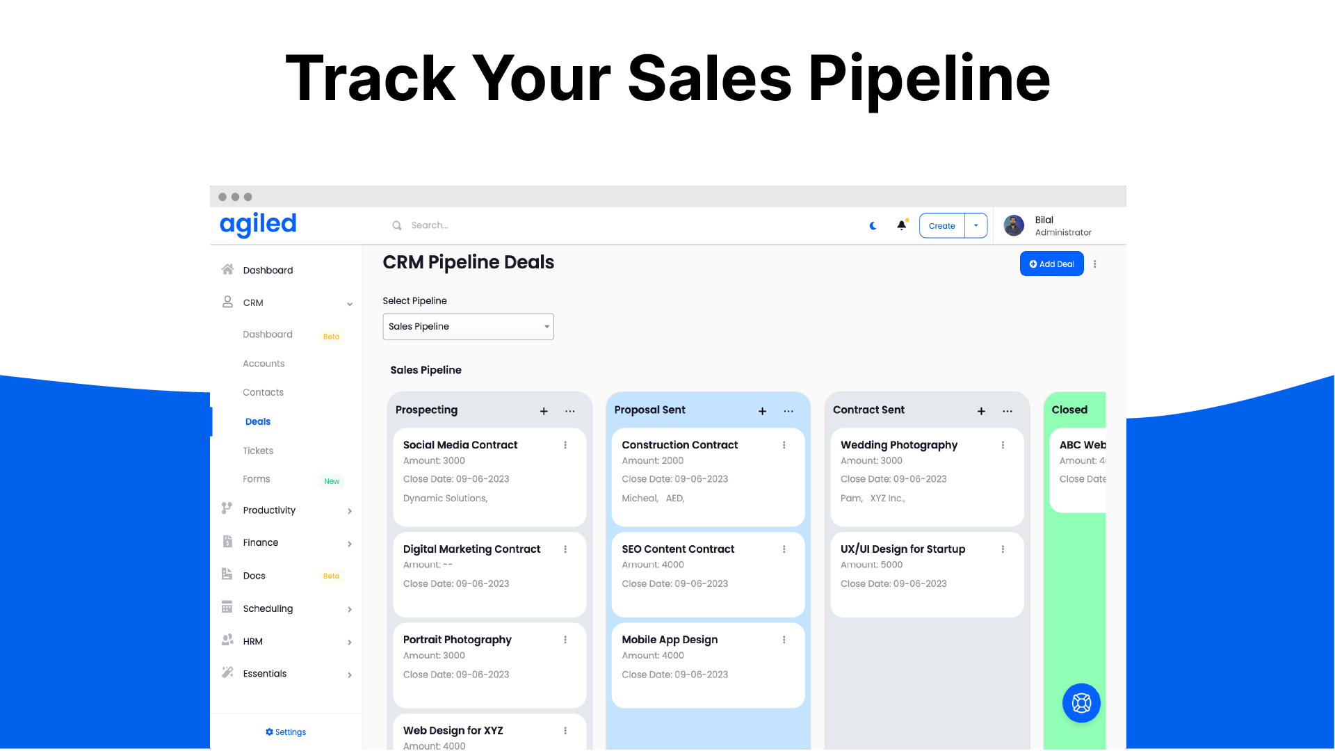 Add clients and leads with the built-in CRM or quickly import them through integrations with other CRMs. You can even create multiple sales pipelines right from Agiled’s CRM.