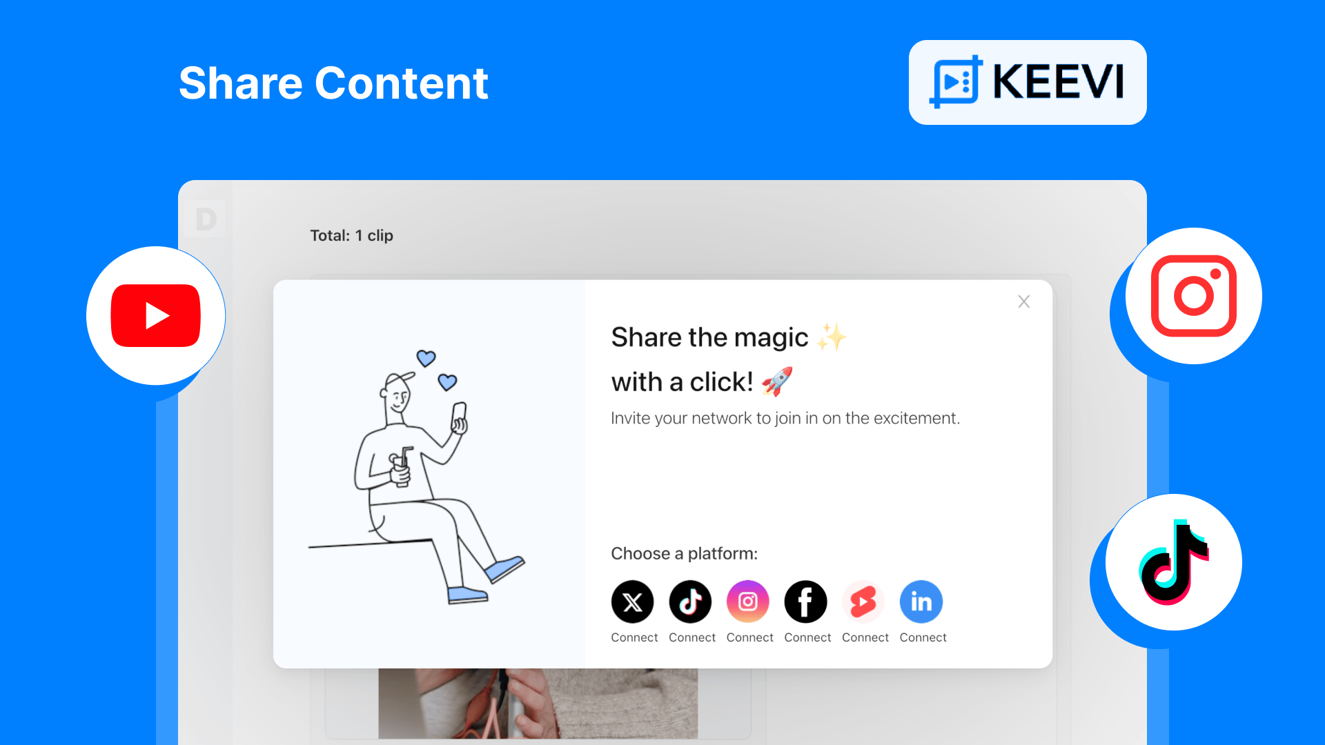 Publish your bite-sized clips to different social media platforms without leaving Keevi.