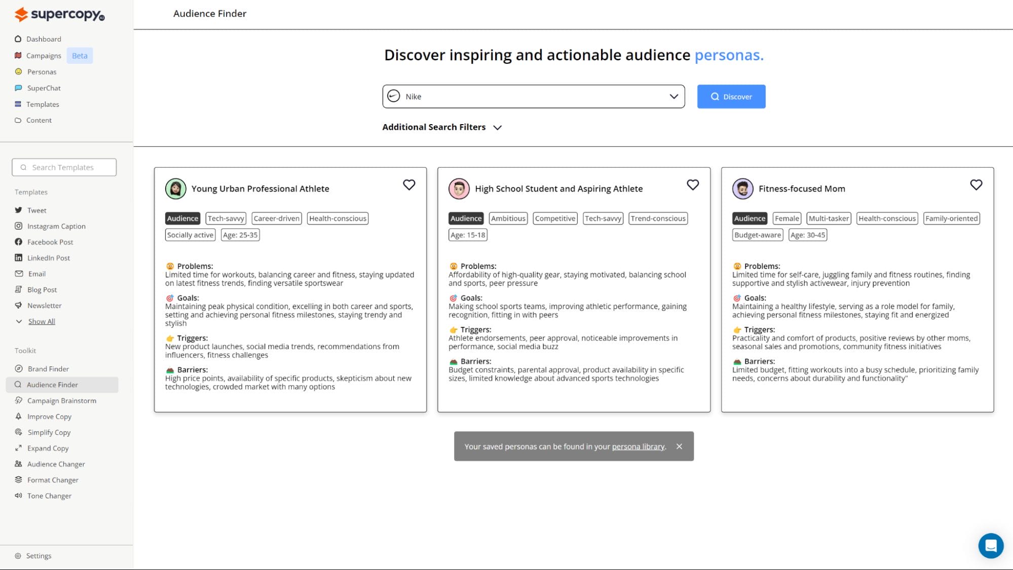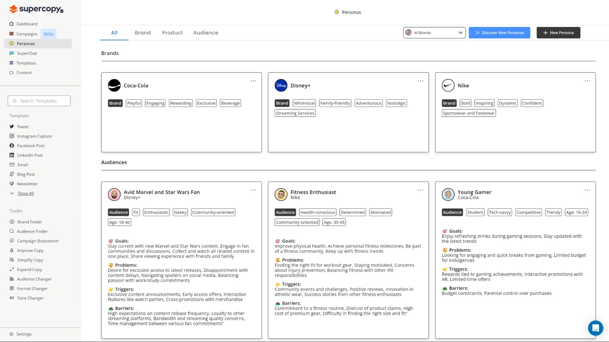 SuperCopy.ai lets you whip up comprehensive personas for your brand, product, or audience in a matter of minutes.