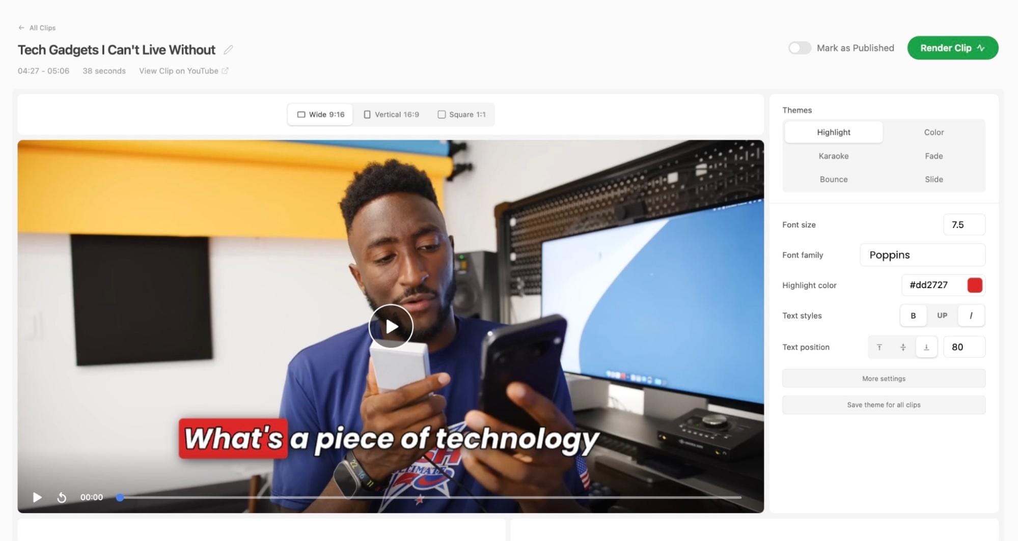 Turn your long-form videos into shareable clips for social media, complete with metadata, subtitles, and more