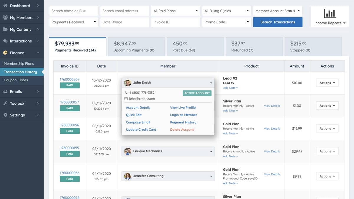 Get an overview of your transaction history, including payments received, upcoming payments, past due, refunded, and stopped.