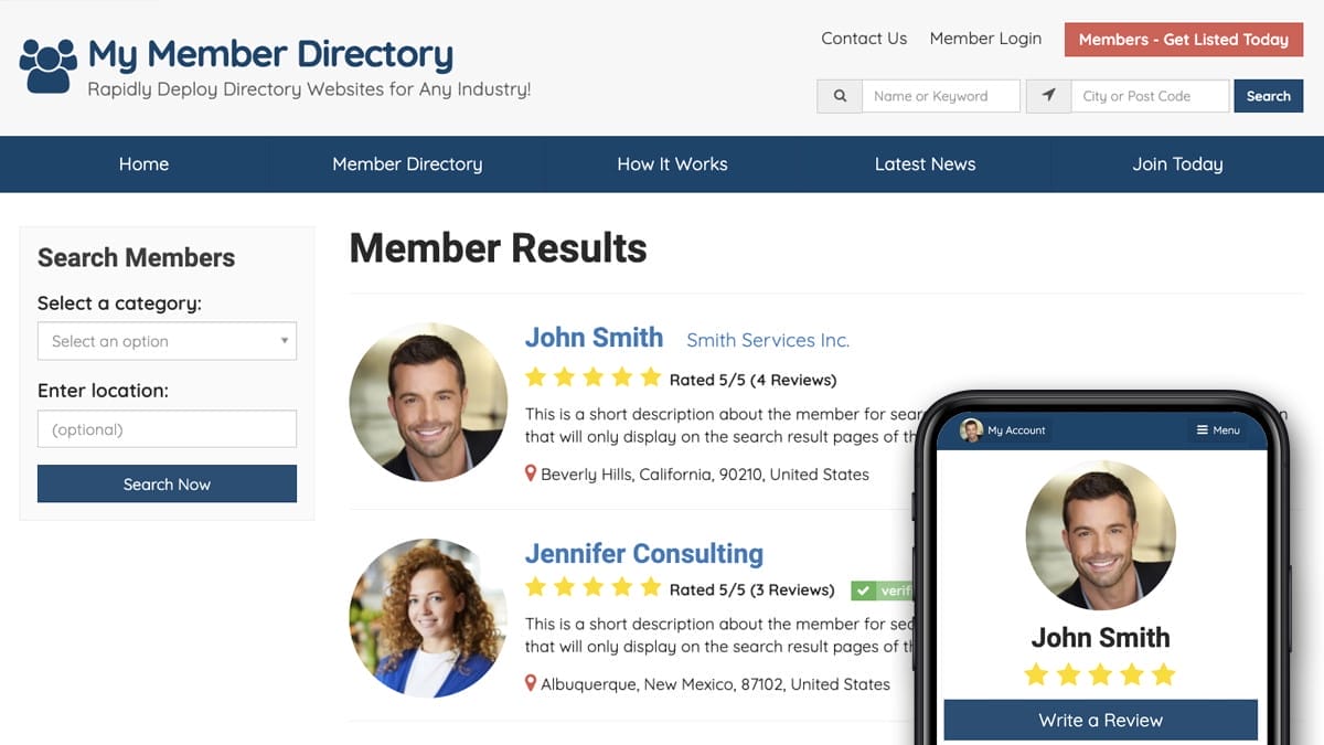 Build a business, hobby, professional, or city directory so site visitors can find and contact your professional members for services