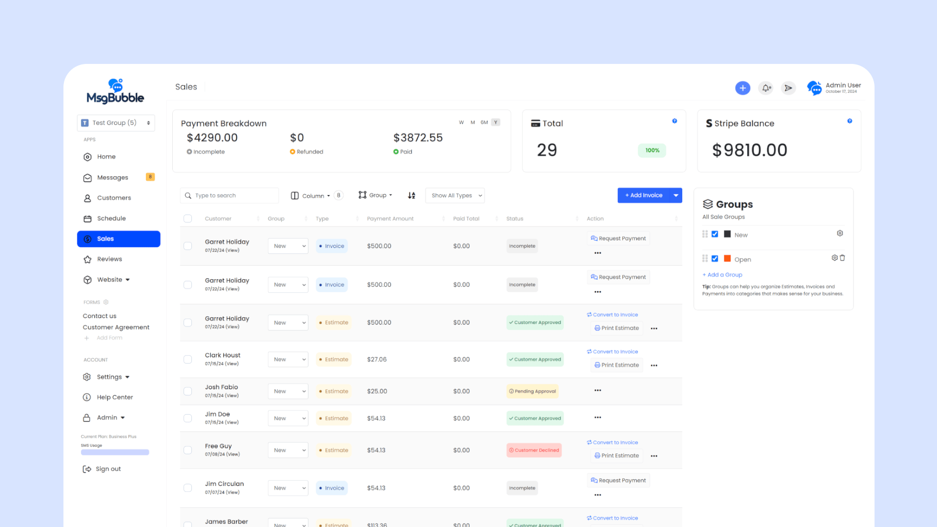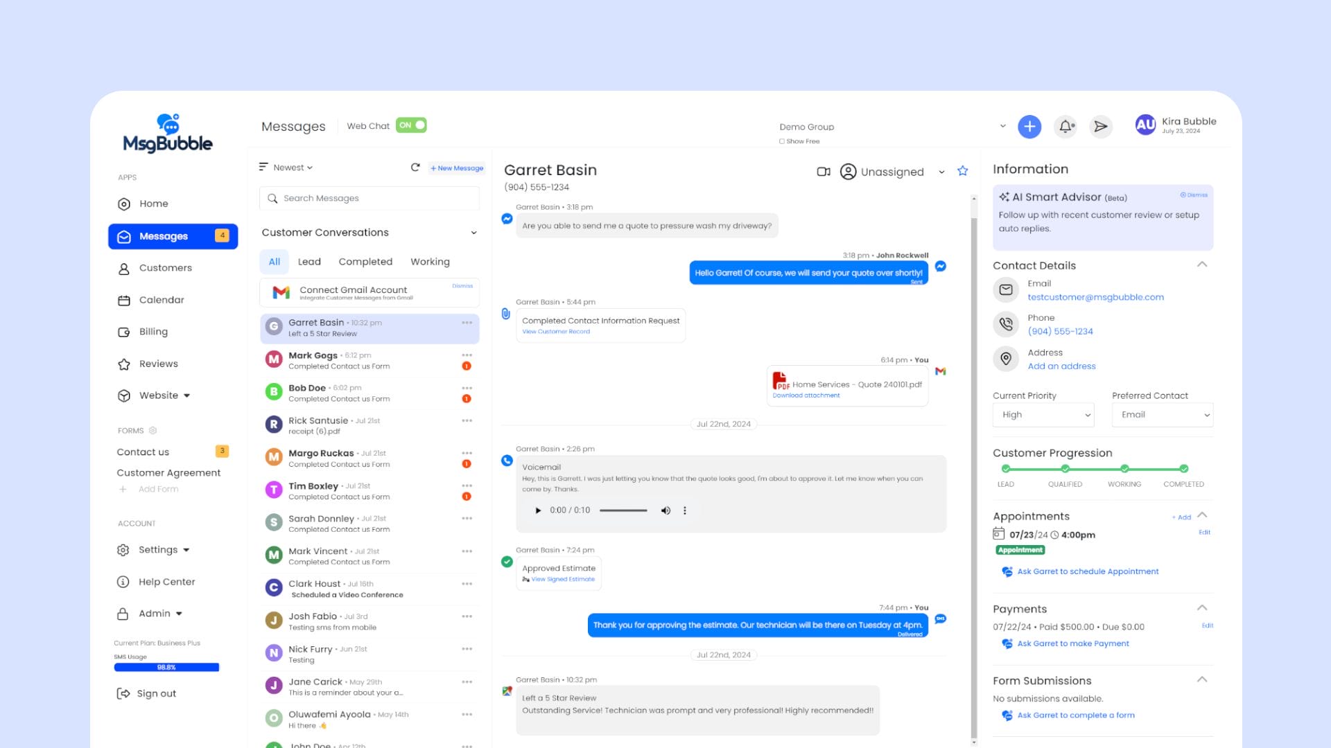 With MsgBubble, you’ll be able to handle all your communications, appointments, invoices, and customer reviews in one place.