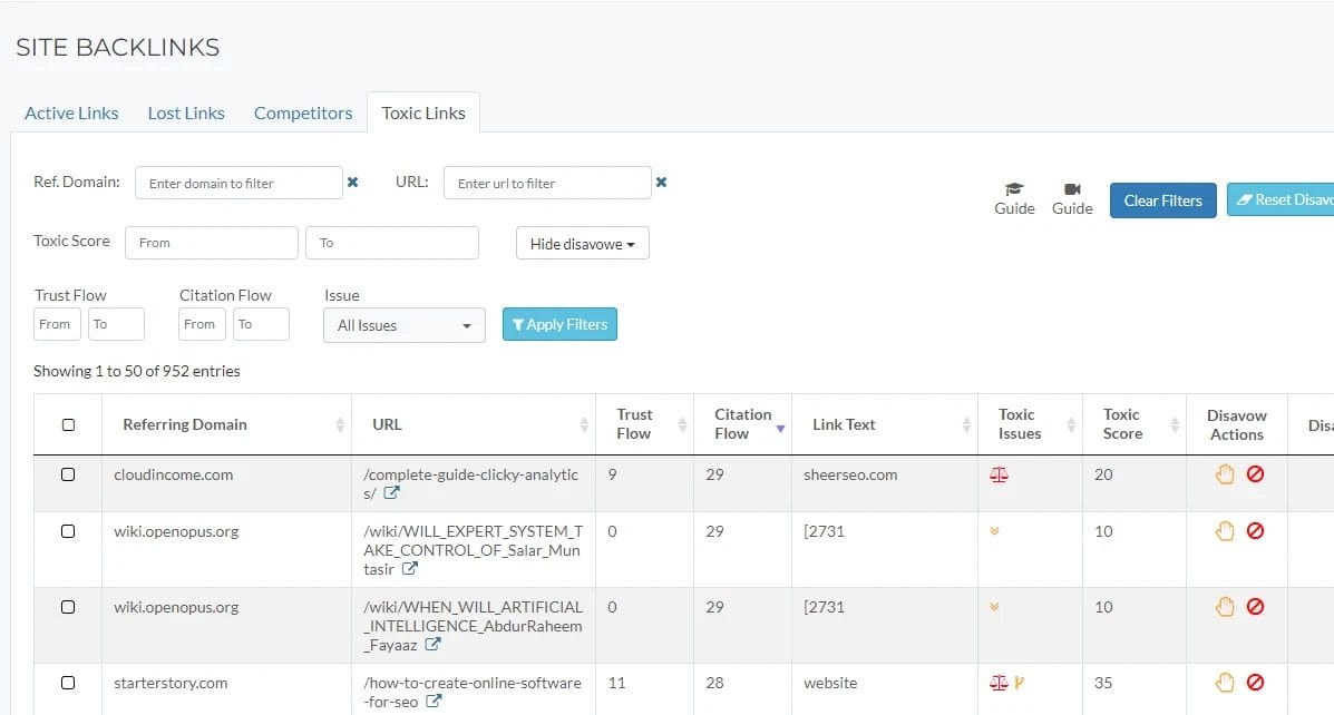 With SheerSEO, you can check the value of your backlinks with metrics like link text, citation, trust flow, and the number of outbound links.