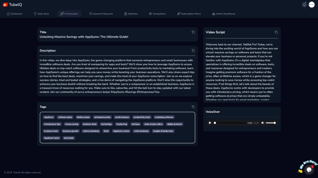 Create scripts, video titles, descriptions, and tags from a single keyword.