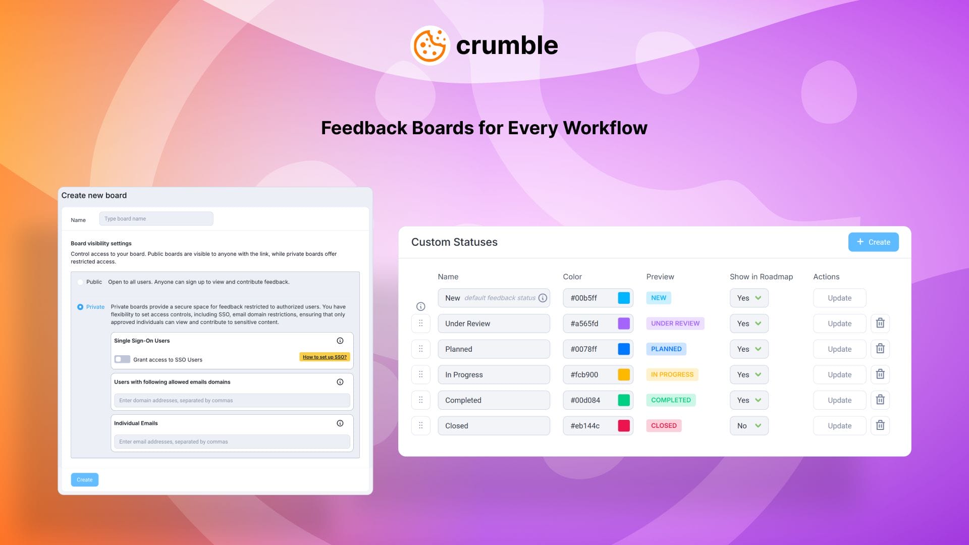 Collect customer feedback using a dedicated board or Crumble’s site widget.
