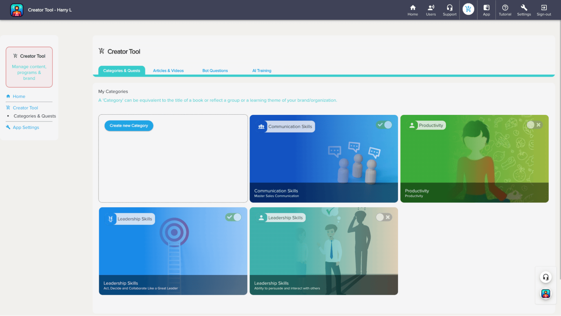 Add educational content by uploading videos, text, articles, and quizzes, and then organize it into categories for easy access