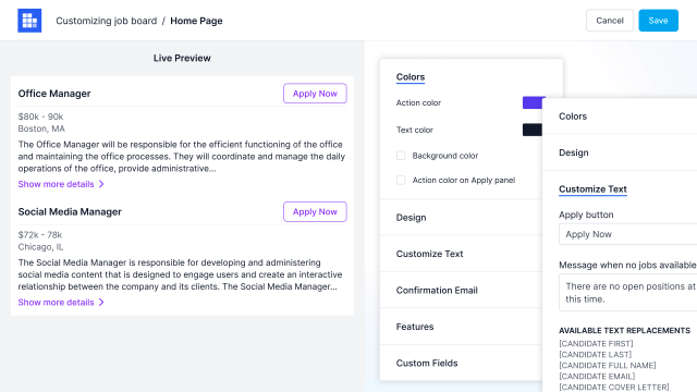 Customize colors, text, screening questions, file uploads, and features like search and location filtering—and preview it all before going live!