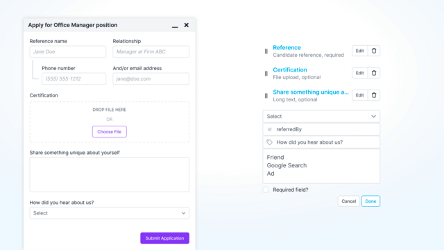 You can do it all: collect short and long text responses, single and multi-select inputs, candidate references, and even extra file attachments for certifications, headshots, or work samples.