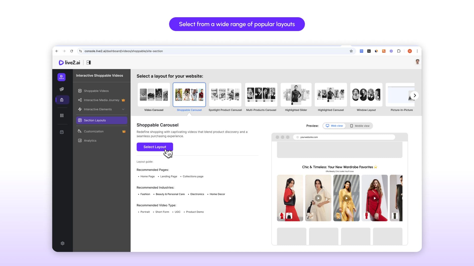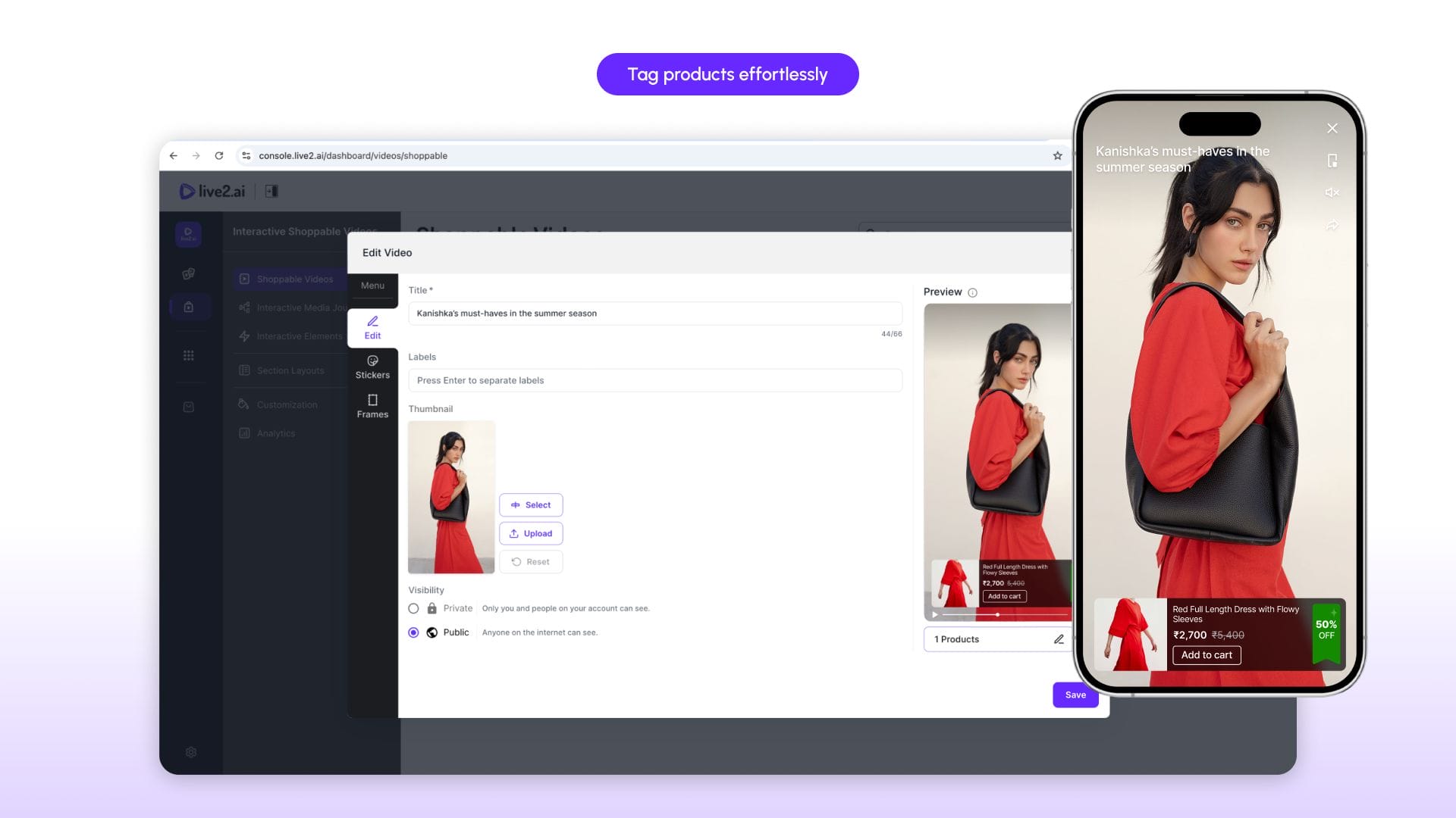 With Live2.ai’s low to no-code interface, it’s easy to create and add shoppable video content to your brand’s website.