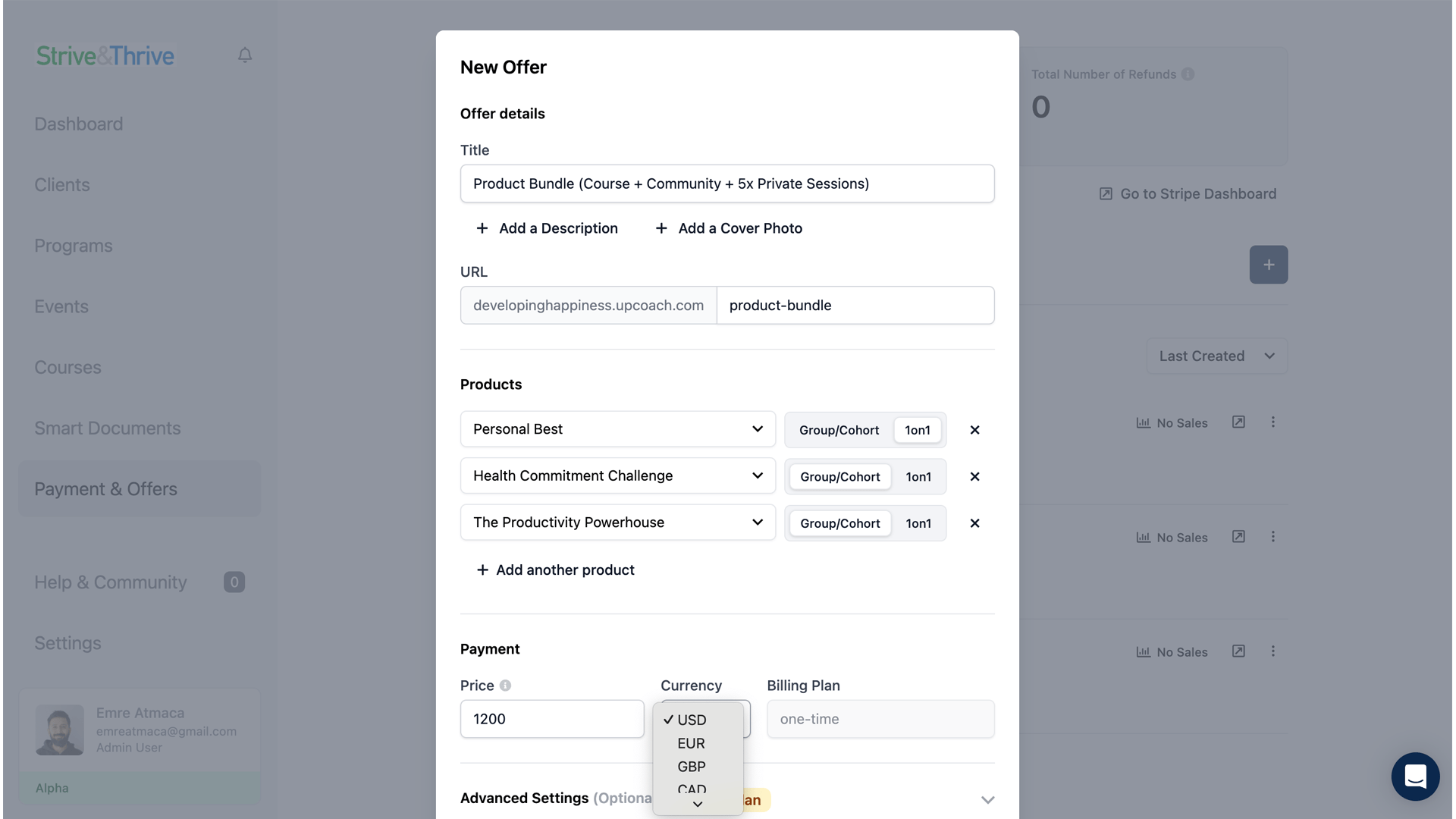 Use the Stripe integration to accept payments with upcoach’s built-in system