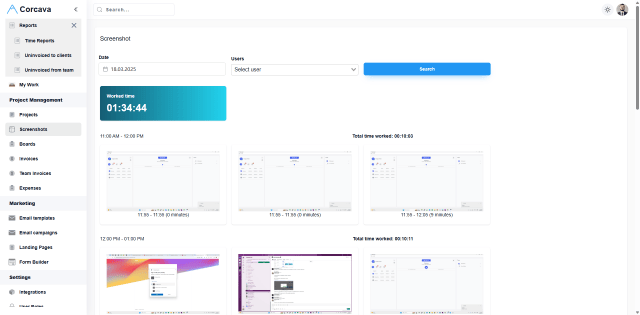 Log work hours and capture screenshots to review workflow trends.
