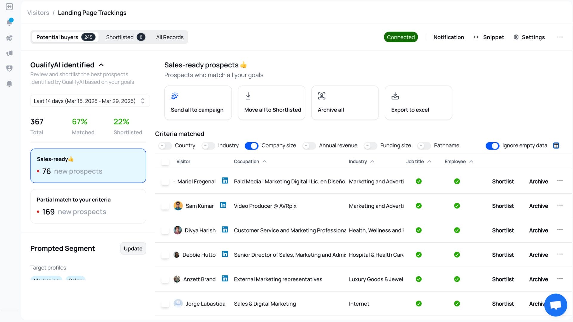 Train the AI to identify ideal prospects by job title, industry, company size, and other filters