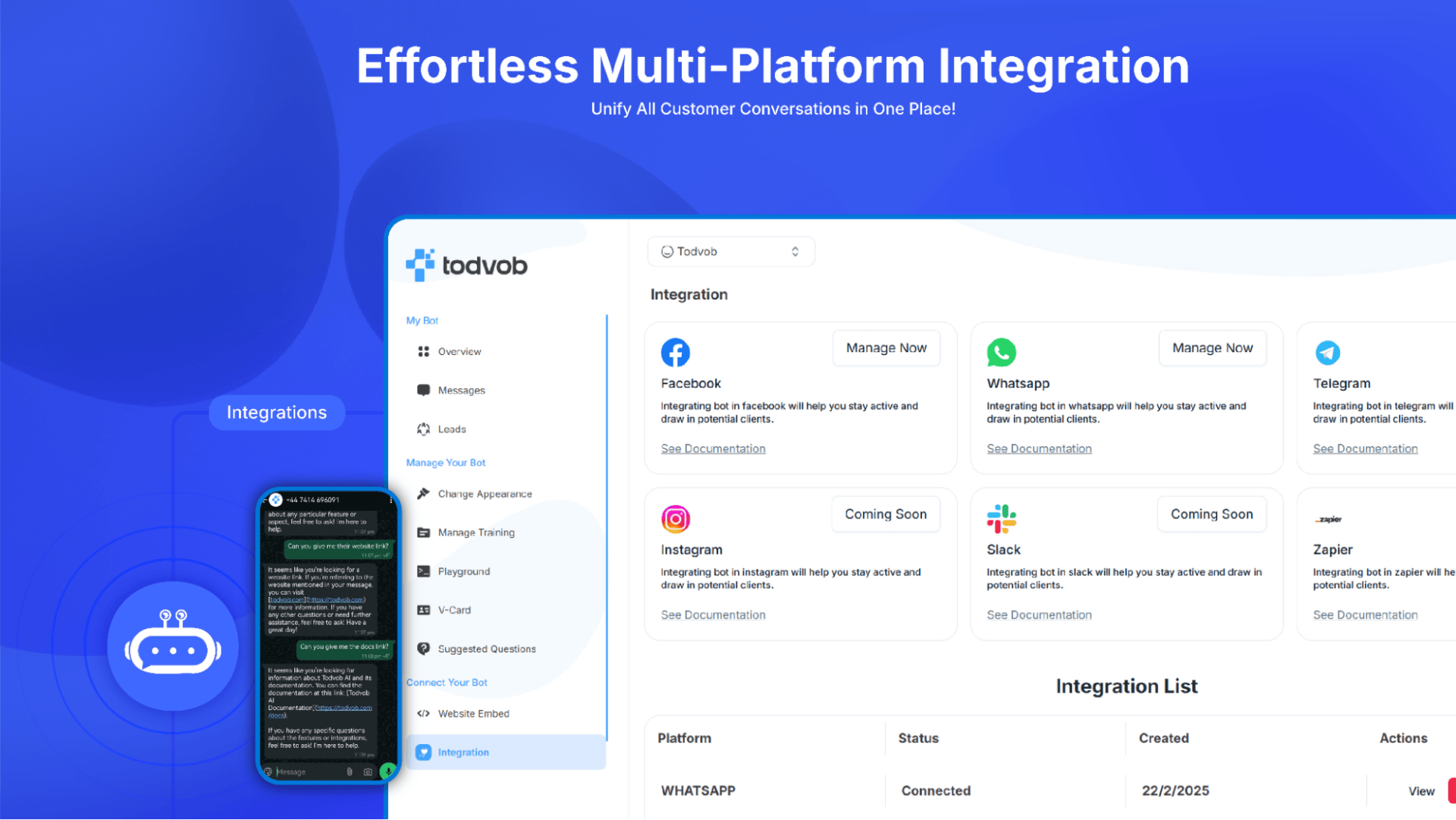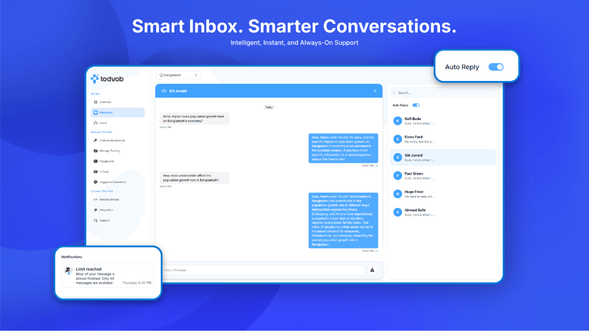 With features like AI-to-human handoff, white labeling, and digital business cards, Todvob helps you automate support and boost revenue.