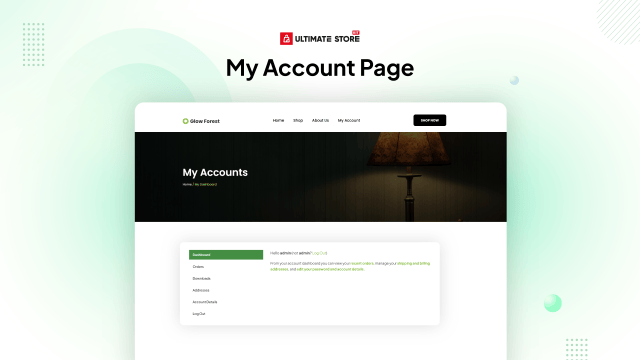 Set up different account pages like login, dashboard, order history, billing address, and more