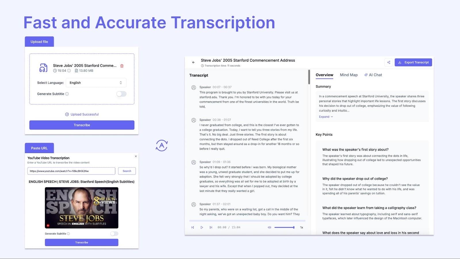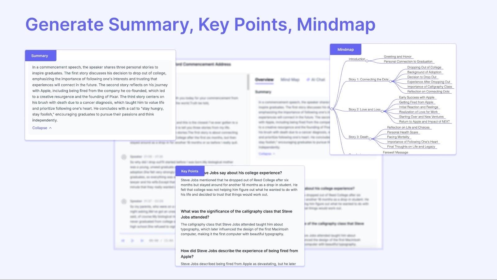 Grasp key info by converting transcriptions into mind maps, summaries, and key points.