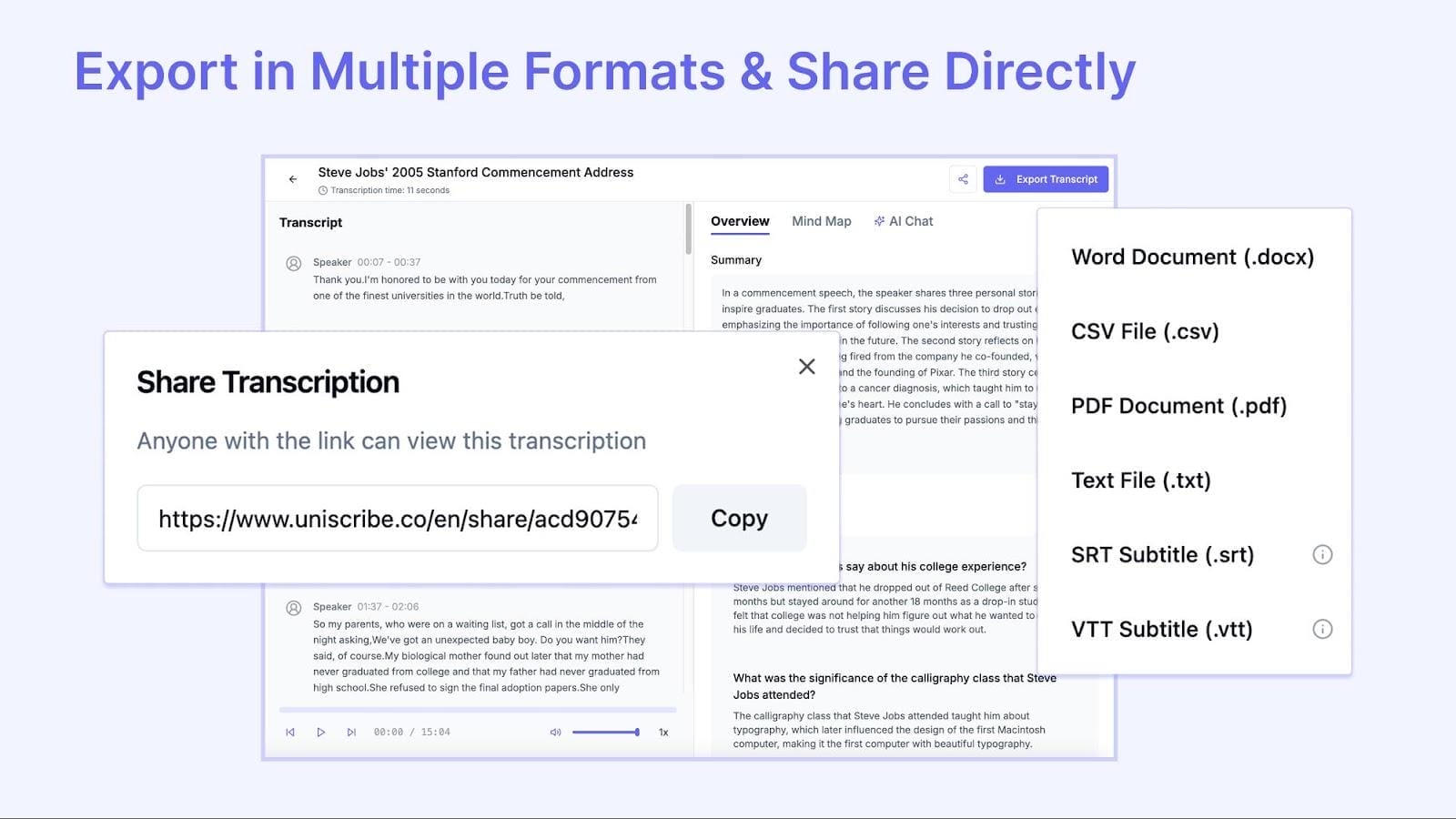 Export transcriptions in multiple formats, including Word, PDF, TXT, CSV, SRT, and VTT