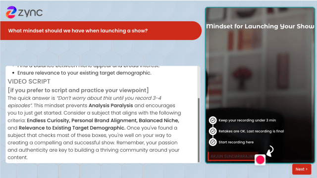 Not sure what to say on camera? Luckily, Zync lets you whip up bite-sized scripts that guide you through each talking point.