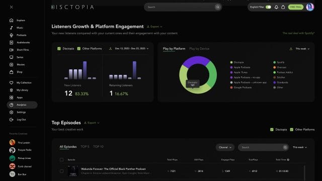You can even track daily and weekly engagement stats, both generally and categorized by the platform, like Spotify, Apple, and Disctopia.