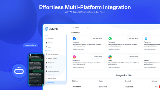 Todvob makes it easy to create AI chatbots that you can deploy across websites, social media, and more.