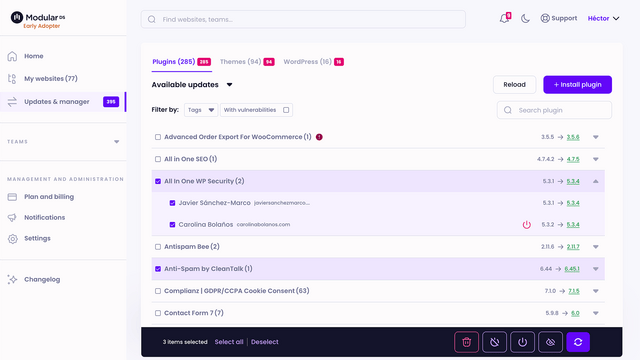 Update, activate, deactivate, or delete plugins and themes—as well as WordPress core versions—across all your websites in one click