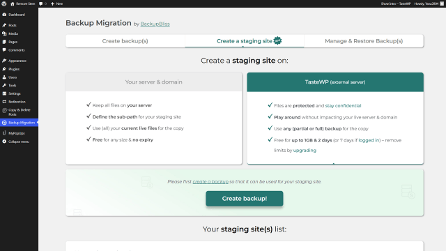 Use TasteWP as a staging solution for your main site with the BackupBliss plugin integration.