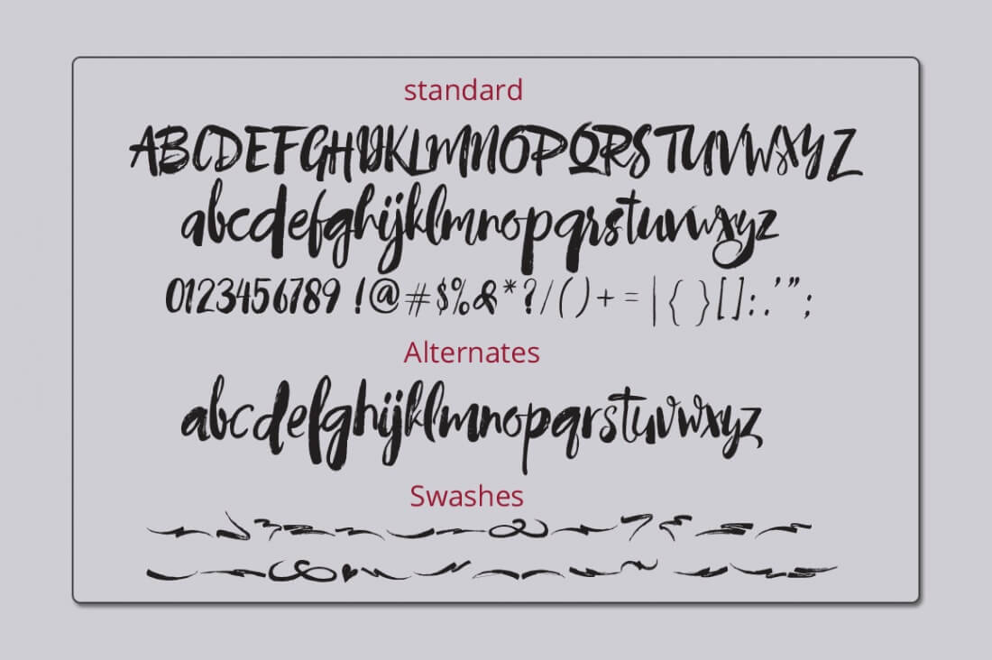 - OpenType Features: Contextual Alternates, Standard Ligatures, Swashes, Stylistic Alternates and 8 Stylistic Sets.