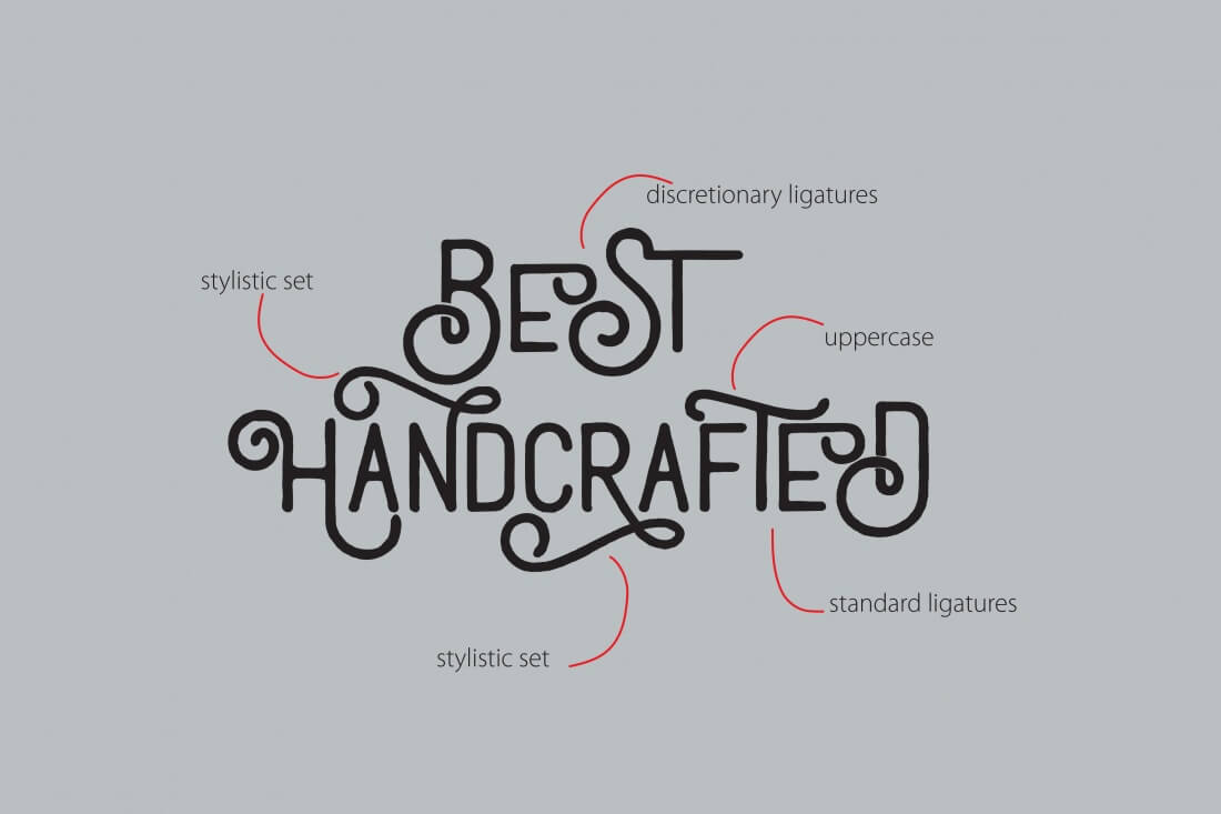 - Stylistic Alternates swashes, Contextual Alternates, Titling Alternates and Ligatures.