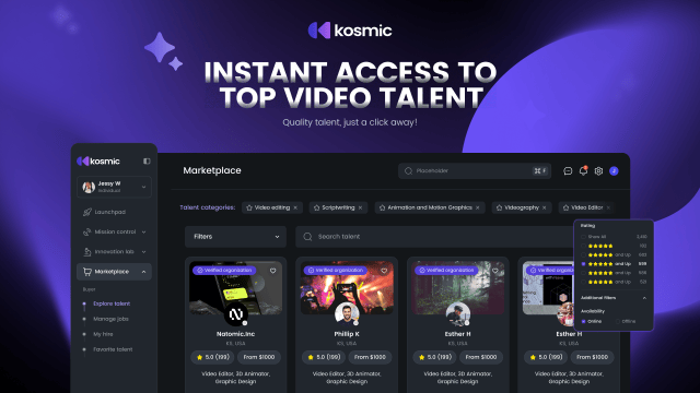 With Kosmic Ai’s marketplace, you can hire top-tier talent for all your video production needs, including video editors, animators, graphic designers, marketers, and scriptwriters.