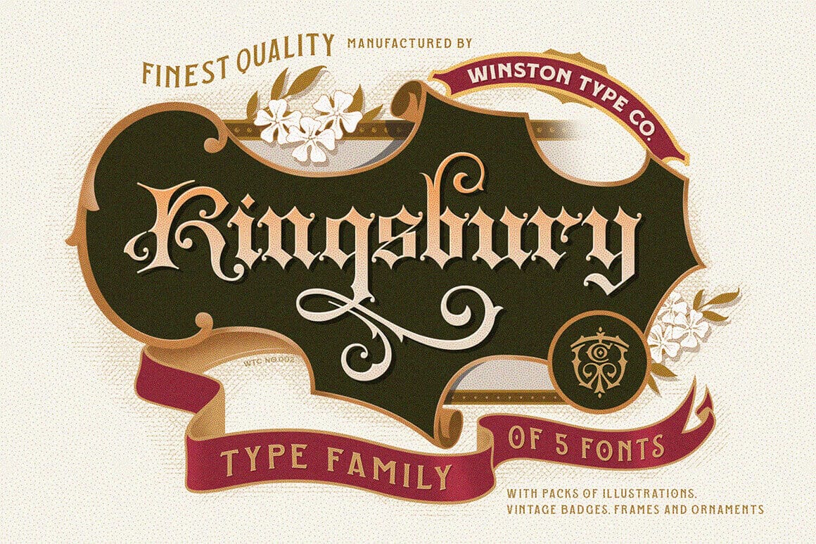 Inspired by the Old English era in Western Europe, WT Kingsbury Gothic exhibits dramatic thin and thick strokes mixed in with the elaborate swirls of the Victorian Age. Mix and match any of the 5 typefaces in this Royal Font Family and toss in any of the gorgeous bonuses from the included design pack to create the perfect project.