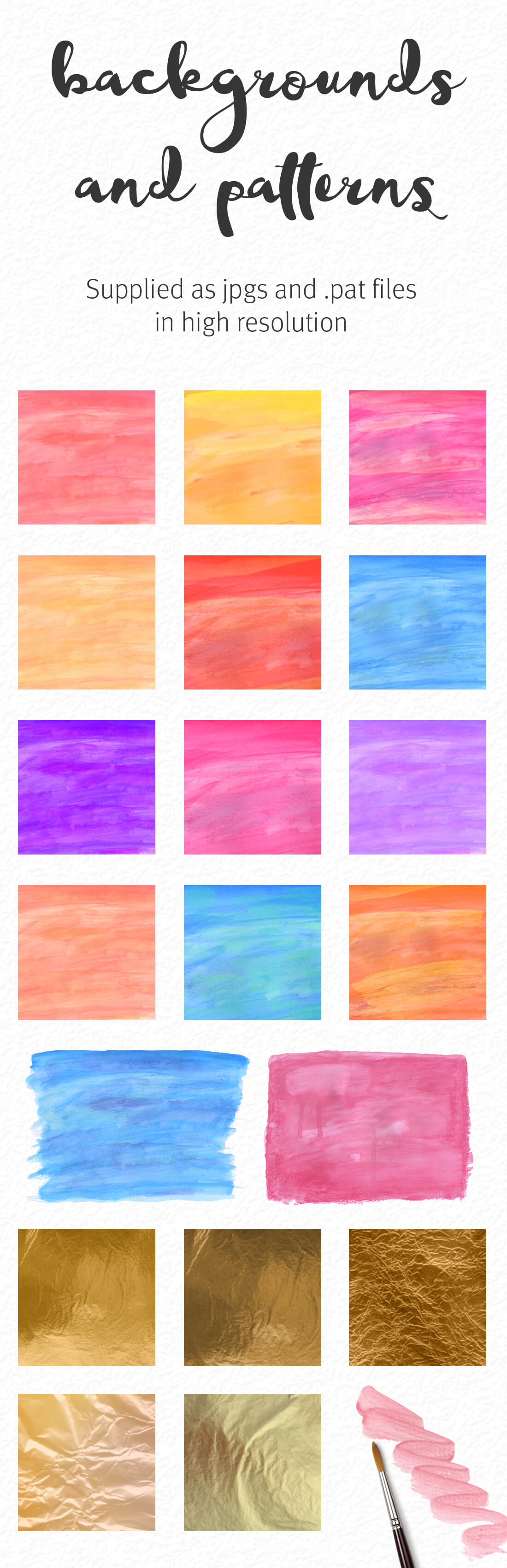 - 125+ Photoshop tools – watercolor patterns, brushes, backgrounds, splotches and more.