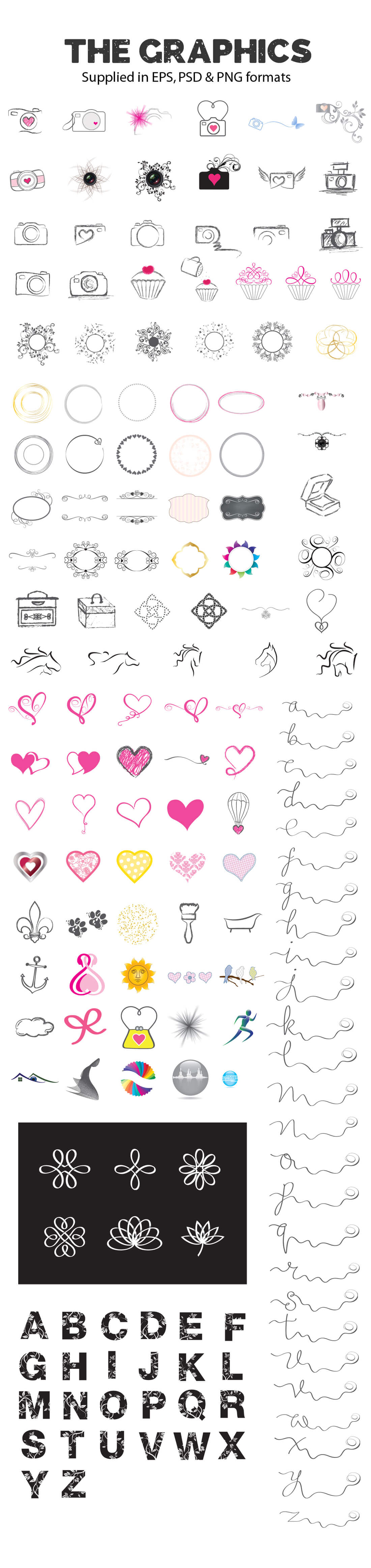 - Wide variety of elements – logos, fonts, doogles, backgrounds, templates and more.