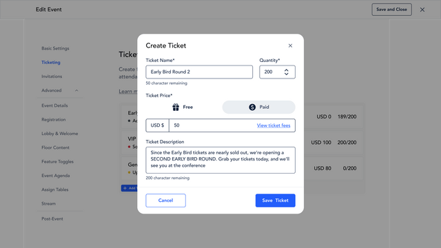Set ticket prices, sales quantity, and descriptions to register attendees stress-free.